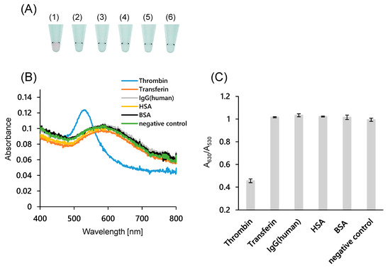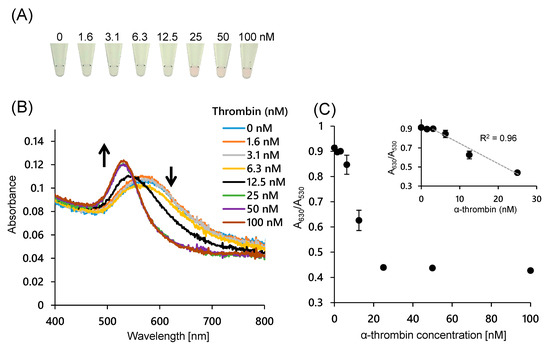 Next, it was investigated whether the color difference of the AuNP solution could be used to detect thrombin. As described above, the addition of thrombin induces double-strand formation between probes and synthesis of RNA strands that have a complementary sequence to the agDNA to inhibit the aggregation of ssDNA-AuNPs. Figure 3A shows the color of the AuNP solution after the addition of thrombin. As shown in the figure, there was a significant difference when higher concentrations of thrombin were added; the solution was red when more than 25 nM thrombin was added, while the color was blue upon the addition of thrombin at lower concentrations. The UV spectrum also supports a color difference with thrombin concentration (Figure 3B). As the thrombin concentration increased, the absorbance derived from the dispersed AuNPs increased, and the absorbance derived from the aggregated AuNPs decreased. The color difference due to AuNP aggregation can be evaluated by the absorbance ratio of A630/A530. A linear dependence of the A630/A530 value was observed for thrombin concentrations ranging from 3.1 to 25 nM. The limit of detection (LOD) of the proposed system was evaluated to be 4 nM. At this point the absorbance ratio was higher than the 3σ line, where σ denotes the standard deviation of zero-concentration background data. The LOD was similar to a result previously reported where thrombin was detected electrochemically using a binding-induced structural change in the aptamer [37]. The method proposed in this study does not rely on structural changes in aptamers, and it is therefore applicable to various sandwich methods using ligands such as antibodies and lectins.