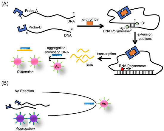 The complementary sequence of each probe was set to six bases because this length did not lead to duplex formation in the absence of the target [32,33,34]. In the presence of thrombin (Scheme 1A), a sandwich-type interaction between thrombin and the DNA aptamers occurs, and DNA polymerase performs a DNA extension reaction from the 3′-end of the DNA where the duplex is formed. RNA polymerase then repeats RNA synthesis due to the presence of RNA promoter sequence duplexes. The synthesized RNA was utilized to modulate the AuNP aggregation process for colorimetric thrombin detection.
