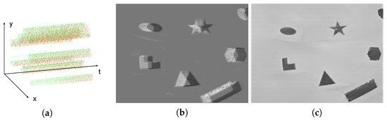 a new event is generated. In the above formulas, is the time elapsed since the last event occurred at the pixel, and represents the polarity of intensity change. when the intensity change between the current event and the previous event at the same pixel is positive, while when the change is negative. A generated event can be expressed as . Figure 1a illustrates a sample event stream in the duration of 0.1 s, while red and green points represent positive and negative events, respectively.