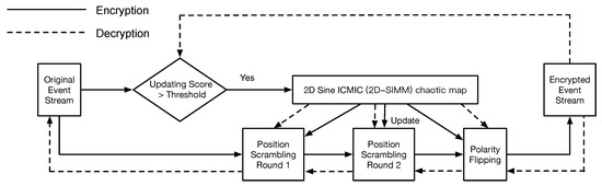 Inspired by the encryption scheme for traditional images [35], we extend the approach of scrambling pixels’ positions for shuffling both events’ positions and their polarities. The encryption and decryption framework is illustrated as Figure 4. The main idea of the proposed framework is that several pseudo-random sequences, generated using a chaotic map and updated over a period of time, can securely map an event’s position and polarity to another position and polarity. Concretely, a two-dimensional chaotic map [35] firstly generates six pseudo-random sequences, which are employed to randomly shuffle original events (scrambling position and flipping polarity), and an indicator, updating score, is designed to control the updating speed of the sequences according to the type of NVS and the hardware configuration.