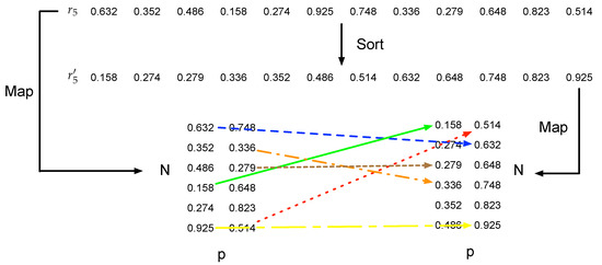 which means that an event at the position moves steps right-forward to . If the changed y exceeds the boundary M, the movement will start from the and end with . Similarly, the scrambling on x under is formulated as: