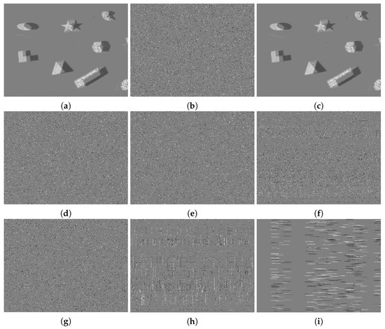 The sensitivity study on the secret keys. (a) The original event image. (b) The event image after encryption. (c) The event image after decryption with the correct secret key . (d–i) The event images after decryption with incorrect secret keys , , , , and , respectively.