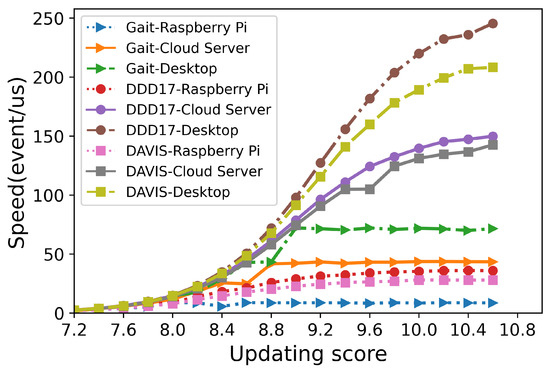 The relationship between the updating score and the number of events processed per second (in s) using different NVSs on various platforms.