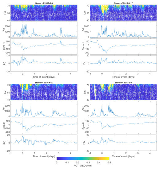 Figure 2, Figure 3 and Figure 4 present stacked plots of the ROTI, AE, Sym-H and PC index series for severe, strong and moderate storms, respectively. All data series are centered on the storm maximum point estimated with regard to the maximum value of AE and minimum of the Sym-H value. Krankowski et al. [36], in a study of auroral irregularities, divided ROTI into two ranges: between 0.3 and 0.5 and above 1.5 TECU/min. Thus, in our study we applied the ROTI of 0.4 TECU/min threshold. Such an approach would also result in a better readability of the color-scaled two-dimensional ROTI series. Sub-auroral ROTI values during serious events usually exceeds the level of 1.00 TECU/min, reaching the maximum level of a few TECU/min. For a proper assessment of whole event, the data series also includes the 24 h before the storm’s peak and the 4-day period after the main phase ended. We have also computed ROTI series for a pre-storm quiet time reference with a Kp below 3 and Dst not decreasing below −30 nT. Quiet time ROTI analysis did not reveal any spread of the high irregularities below 70 N; therefore, all high sub-auroral ROTI occurrences seem to be connected with disturbances in geomagnetic conditions.