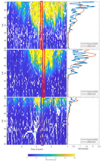 Selected results of GNSS ROTI/Swarm RODI validation are presented in Figure 5. A window in the storms two-dimensional series marks the time it took Swarm A satellite to pass above the longitudinal 10–20 E band. The linear plot presents the latitudinal profile of GNSS ROTI in that particular moment compared with Swarm-derived RODI. The GNSS ROTI profile has been calculated as an average from a 15 min period (three epochs marked with red box in Figure 5), since the Swarm spacecraft’s passage over the studied area lasts around 10 min.