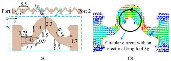 Radiation element and array. (a) Structures and dimensions of radiation element and array. (Unit: mm). (b) The current distributions on the curved microstrip line.