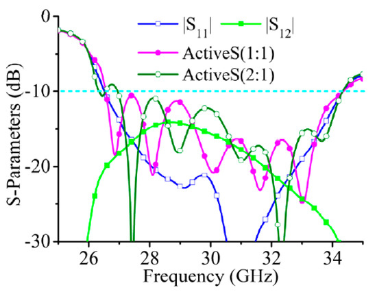 The simulated S-parameters are shown in Figure 3. As the two ports need to be excited simultaneously when the array is working, the isolation between the two ports influences impedance matching; thus, active S(1:1) and active S(2:1) are used here to express the impedance bandwidth of the array. In Figure 2, active S(1:1) and active S(2:1) are lower than −10 dB from 29 GHz to 31 GHz.