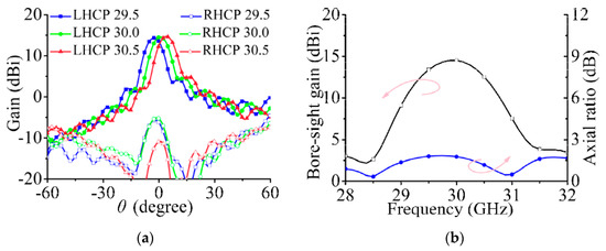 The simulated radiation pattern in the yoz plane when port 1 is excited is shown in Figure 4a. At 29.5, 30, and 30.5 GHz, the maximum radiation directions of the array are −3°, 0°, and 3.3° and the maximum gains are 14.5, 14.7, and 14.6 dBi, respectively. The beam deflections at 29.5 and 30.5 GHz are caused by the characteristics of the series-fed array. The simulated gain and axial ratios at the positive z-axis direction are shown in Figure 4b.