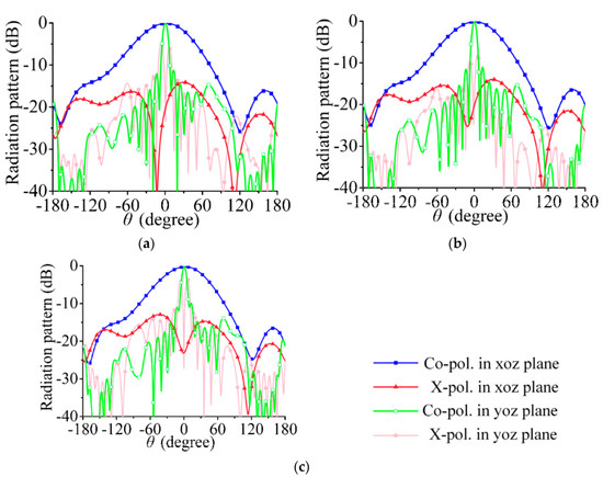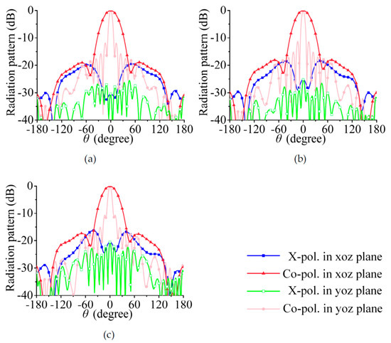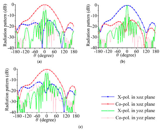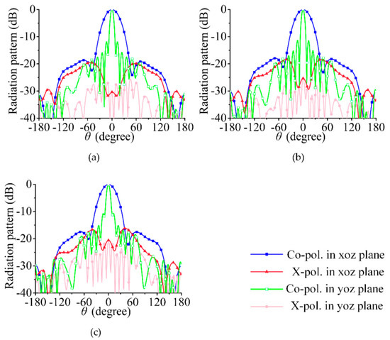 Simulated radiation pattern. (a) 29.5 GHz, (b) 30 GHz, (c) 30.5 GHz; co-polarized waves are −45° linearly polarized wave.