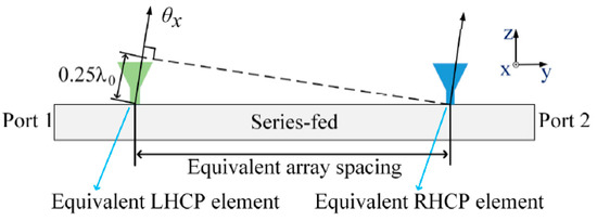 The reasons for the phase difference between the RHCP and LHCP components are discussed below. The structures of the radiation elements in the series-fed array are the same. Thus, when port 1 is excited, the radiation elements near port 1 radiate most of the energy. When port 2 is excited, the elements near port 2 radiate most of the energy. Therefore, as shown in Figure 9, although the RHCP and LHCP waves are radiated by the same series-fed array, the phase centers of the two components are not in the same position. This situation can be attributed to an excessively large array spacing; the greater the number of elements in the series-fed array, the larger the equivalent array spacing will be. However, the equivalent array spacing cannot be reduced by reducing the number of elements as the isolation between port 1 and port 2 will worsen.