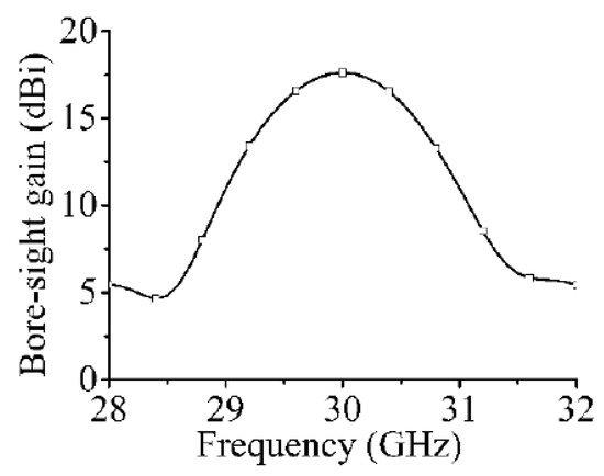 The simulated bore-sight gains of the array are shown in Figure 13. The maximum gain at 30 GHz is 17.6 dBi, which is 2.9 dBi higher than that of the single series-fed array in Figure 6.