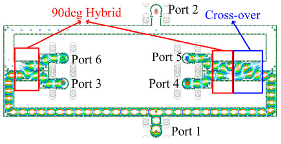 The structure of the feeding network is shown in Figure 14. Two 90° hybrids and a crossover are set up in the feeding network to produce the desired amplitude phase output. The feeding network is designed by SIW transmission line. In order to test the feed network, the SIW transmission line is connected to the coaxial port, and the interconnection structure is introduced in detail [26]. The design process of SIW 90° hybrid, and crossover is introduced in detail in [32]. In Figure 14, we find that the feed positions of port 1 and port 2 are not centered, which provides a 180° phase difference between ports 3, 6 and ports 4, 5. The 90° hybrid on the left can form a 90° phase difference between ports 3 and 6. With the 90° hybrid and crossover on the right, the four output ports can achieve equal amplitude output, and the phase difference between adjacent ports is 90° or −90°.