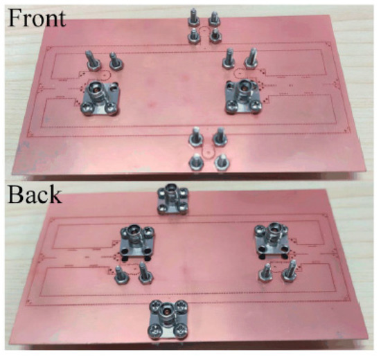 To measure the S-parameters of the processed feeding network, we set the coaxial connectors of port 3 and port 4 above the substrate, and those of port 5 and port 6 below the substrate because the distance between port 3 and port 6 is too small and the installation space of the coaxial connectors is insufficient. This setup results in a 180° phase difference between ports 3 and 4 and ports 5 and 6; such phase differences are directly compensated in Figure 15.