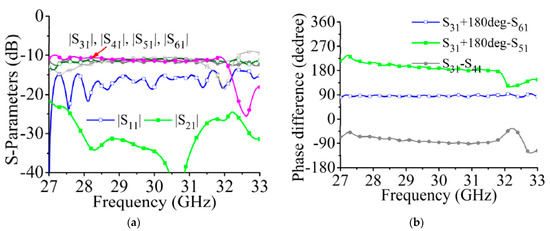 The simulated S-parameters of the feeding network are shown in Figure 15. The four output ports achieve a constant amplitude output in the 29 to 31 GHz frequency band, and the insertion loss is approximately −9.5 dB. The phase differences of the output ports are shown in Figure 15b. When port 1 is excited, the phase relationships of the output ports satisfy the excitation phase required for −45° polarized radiation (Table 1). Considering the symmetry of the feeding network, we omit the results for when port 2 is excited.