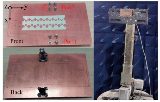 The processed feeding network is shown in Figure 16. The measured S-parameters of the feeding network are shown in Figure 17. In the 29 to 31 GHz frequency band, the insertion loss is approximately −11.3 dB, which is 1.8 dB higher than the simulated result. This difference is mainly due to the roughness of the copper layer.