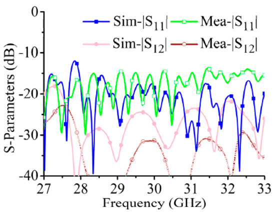 The processed array structure is shown in Figure 20. The comparison of the simulated and measured S-parameters is shown in Figure 21. The measured |S11| are lower than –10 dB from 29 GHz to 30 GHz, and the measured port isolations are greater than 20 dB from 29 GHz to 20 GHz.