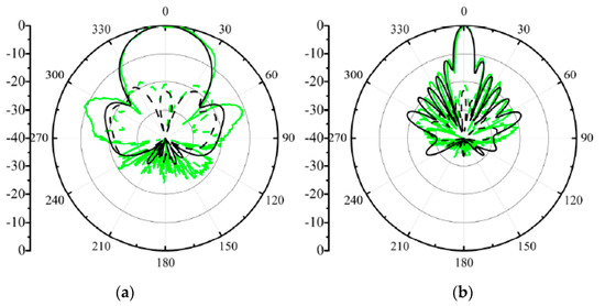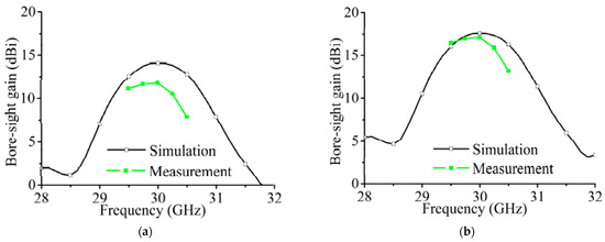 The comparison of the simulated and measured bore-sight gains is shown in Figure 22a. The simulated and measured maximum gains at 30 GHz are 14.2 and 11.8 dBi, respectively. To eliminate the influence of the feeding network on the array gain, we provide the array gains and insertion losses of the feeding network in Table 2. For the simulated results, the gain of the array without a feeding network can be estimated by the following equation:
