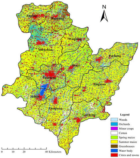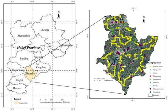 The study area is Hengshui City, located in the southeast of Hebei Province, China, with a total area of 8815 km2. Hengshui City belongs to the semi-humid and semi-arid monsoon climate zone in the warm temperate zone, with four distinct seasons, sufficient sunshine and annual average precipitation of 500–600 mm. The study area has rich land resources and diverse soil types, which are suitable for planting and growing a variety of crops, and the coverage rate of crops is more than 70%. The crop types in Hengshui City include winter wheat, summer maize, spring maize, cotton, fruit trees, greenhouse vegetables, etc. The main planting mode is winter wheat–summer maize rotation, two crops a year, and spring maize, cotton and other crops once a year [,]. The Heilonggang River Basin in Hebei Province, where the study area is located, is a typical groundwater funnel area in China and one of the pilot areas of the national fallow system. In recent years, affected by the national fallow policy and the transfer of rural labor, the planting area of winter wheat with large water consumption has decreased, while the planting proportion of spring maize has increased year by year []. Therefore, the study of crop classification by remote sensing is helpful to timely and accurately monitor the crop planting structure in Hengshui City, and is of great significance to implementing the national fallow policy and promoting the sustainable development of agriculture [].