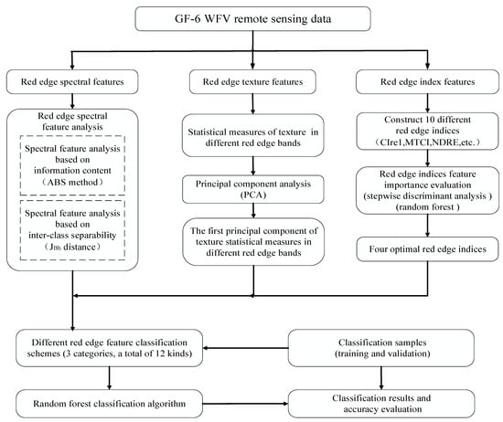 The spectral features of remote sensing images and their derived features such as texture and vegetation index are the main basis of remote sensing image classification. GF-6 WFV data have several new spectral segments, and the feature analysis and optimization of these spectral segments is an important means of tapping into the potential of data application and ensuring classification accuracy. In this study, adaptive band selection (ABS) method and the extension of Jeffries–Matusita distance (JBh) were used to analyze the spectral features of red edge bands of GF-6 WFV data based on information content and inter-class separability. Then, different red edge bands were used to construct the corresponding texture features and 10 different red edge index features. Stepwise discriminant analysis (SDA) and random forest (RF) feature importance evaluation algorithms were used to optimize the red edge indices. Finally, based on the spectrum, texture and optimal red edge index features of different red edge bands of GF-6 WFV data, different red edge feature classification schemes were designed, and the RF algorithm was used to classify crops according to different schemes. The technical route of the study is shown in Figure 2.