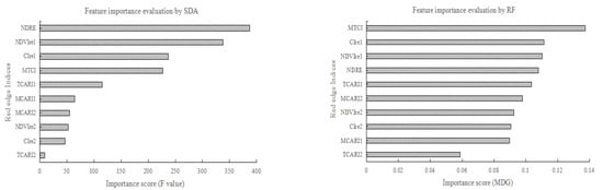 The SDA method of evaluating the importance of different features is mainly based on the F value of different features. The larger the F value, the greater the importance of the corresponding feature, and the smaller the F value, the lower the importance of the feature [,]. In this study, SPSS statistical analysis software [] was used to realize the stepwise discriminant analysis and evaluation of different red edge index features. RF algorithm used random forest classifier model in the scikit-learn machine learning library of Python language to reflect feature importance by mean decrease Gini (MDG) [,]. The feature importance score of different red edge indices based on the two methods of SDA and RF are shown in Table 6, and the evaluation results of the feature importance of different red edge indices are shown in Figure 4.