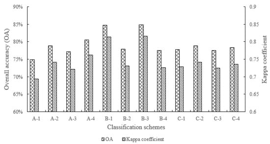 Overall classification accuracy and kappa coefficient of all different classification schemes.