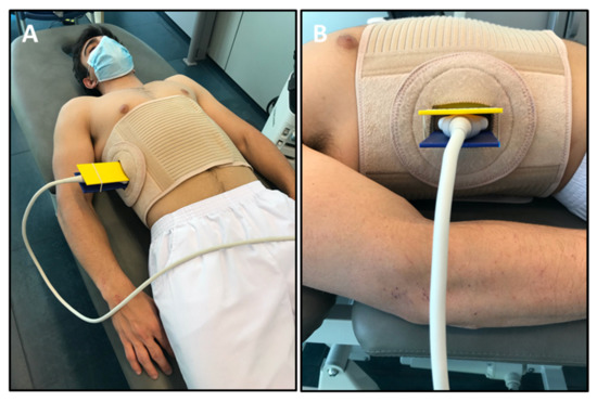 Thus, our research group developed a novel case-control study using the RUSI technique showing a bilateral reduction of the diaphragm thickness upon inspiration and a decreased thickness change during breathing without differences in the diaphragmatic excursion in athletes with lumbopelvic pain compared to healthy athletes [30]. The manual procedure used in this study to fix the US probe during diaphragm thickness evaluations showed excellent reliability. Nevertheless, the standard error of measurements (SEMs) and minimum detectable change (MDCs) values in conjunction with the small thickness changes of the diaphragm during breathing assessed by transcostal RUSI presented some difficulties when interpreting the resulting differences that in some cases exceeded measurement errors even when expert evaluators performed the measurements. Some custom-made ultrasound probe holders were designed to measure abdominal and hip muscle thickness changes during functional activities [31,32] although prior studies have not yet applied thoracic orthoses and ultrasound probe holders in the thoracic region to assess diaphragmatic thickness. These issues justified the development of a specific thoracic orthotic device in order to reduce measurement errors of the diaphragm thickness assessed by transcostal RUSI using a probe manual fixation. Thus, we hypothesized that the novel thoracic orthotic device could allow fixation of the US probe to facilitate a valid and reliable transcostal evaluation of the diaphragmatic thickness during breathing in order to reduce measurement errors introduced by manual fixation of the probe. Finally, our purpose was to determine the intra- and inter-sessions and intra- and inter-rater reliabilities as measured by transcostal RUSI in addition to concurrent validity of diaphragm thickness measurements obtained during breathing from this thoracic orthotic device versus manual fixation used to fix the US probe in athletes with non-specific lumbopelvic pain.