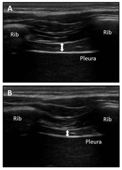 B-mode diaphragm thickness ultrasound imaging visualizing the last intercostal space following the mid-axillary line from the inferior edge of the 11th rib to the superior edge of the de la 12th rib of the thorax. (A) Diaphragm thickness (white arrow) at maximum inspiration (Tins) during relaxed breathing. (B) Diaphragm thickness (white arrow) at maximum expiration (Texp) during relaxed breathing.