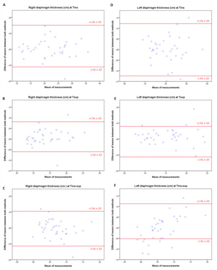 Finally, Bland–Altman plots demonstrated an adequate agreement between both manual and specific orthotic device measurement methods for the right and left diaphragm thickness at Tins, Texp and Tins-exp due to visual distribution of the difference mean between each pair of measurements on the Y axis versus the mean for each pair of measurements on the X axis, which did not show systematic measurement errors (Figure 3). Most measurements were between upper and lower limits of agreement (LoA).
