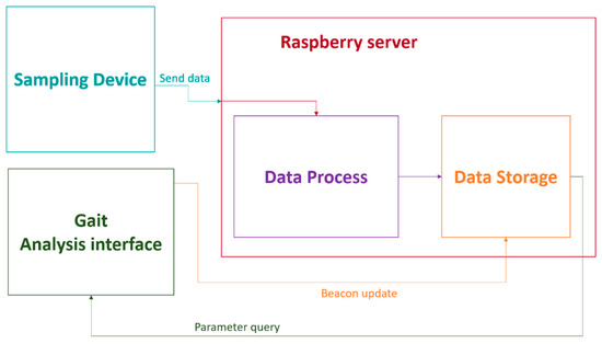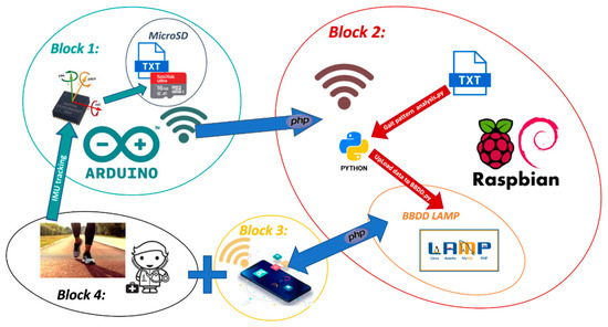 In Figure 4 the data transfer process, through the blocks 1, 2 and 3 of the architecture, is described. The data recorded during tests in “Block 1” (inertial or sampling device) is stored in a text document on the microSD and sent by WIFI. On the server, these data are collected using a PHP file that stores it in a text document. When all data are sent, algorithms that calculate the walking pattern parameters are executed (red arrow, Figure 3). When the gait pattern parameters are obtained, they are uploaded to the BBDD with the patient identification number corresponding to the beacon used to send the data (purple arrow in Figure 3).