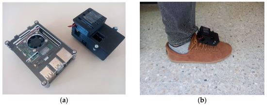 Server (Raspberry) and G-STRIDE (“sampling device”). In picture (a) the server implemented in a Raspberry Pi model 4B and the G-STRIDE device with its case are displayed. In picture (b) sampling device is attached to the shoe with laces or Velcro.