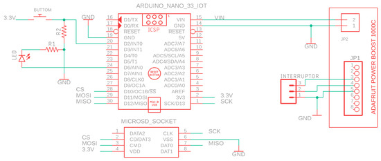 This section explains the implementation of the G-STRIDE sampling device. This device was designed to take inertial measurements and generate a walking pattern in post-processing and Wi-Fi connectivity. For this reason, the Arduino NANO 33 IoT board was used (Arduino, Scarmagno, Italy), which has a 6-axis IMU and a WiFiNINA module. A PCB board was designed to incorporate the Arduino board together with a voltage booster for the LIPO battery and a microSD card reader as shown in the schematics of Figure 3.