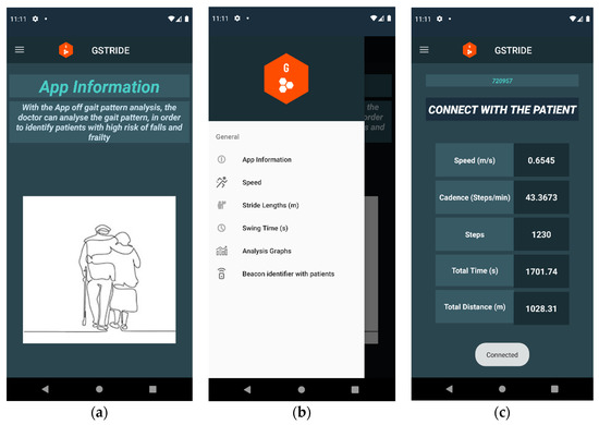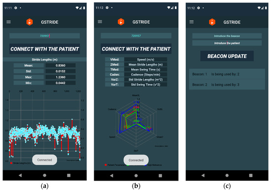 View 2: Mobile application. In Screenshot (a), parameters of each subject are displayed with text views and graph with each stride length of the subject during the test. In the second screenshot (b) a radar graph is displayed with some parameters of the selected patient (red line) and compared with top (blue line) and low (green line) reference values of each parameter of the total sample. In the third screenshot (c), each beacon can be updated with the subject identifier.