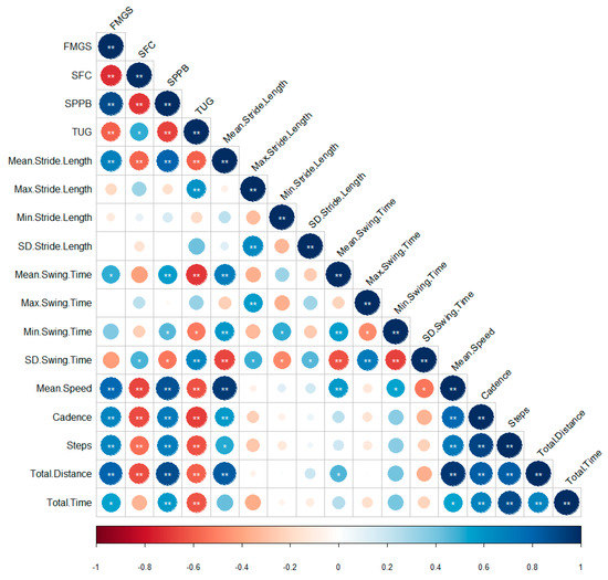 Correlations between Clinical Tests and Gait Characteristics obtained by G-STRIDE Device. The bigger and the more intense the color is, the higher the correlation. Blue means positive correlations and red negative correlations. ** Shows a significant correlation at the 0.01 level and * at the 0.05 level. Four-Meter Gait Speed (FMGS), Standardized Frailty Criteria (SFC), Short Physical Performance Battery (SPPB), Timed Up and Go Test (TUG).
