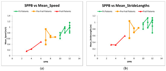(a,b) SPPB versus mean Speed and mean Stride Length. Differences in mean speed and mean stride length between frailty groups according to SPPB classification. Each point represents the score in SPPB versus mean speed and mean stride length of each subject.