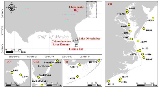 In situ surface temperature data for the CB, Lake Okeechobee (LO), CRE, and FB were obtained from the National Data Buoy Center (NOAA NDBC), South Florida Water Management District (SFWMD), and Sanibel-Captiva Conservation Foundation River, Estuary, and Coastal Observing Network (SCCF RECON) (Figure 1 and Table 1). The thermal sensors are mounted on buoys, Coastal-Marine Automated Network (C-MAN) stations, platform-based stations, or other water quality stations. NDBC thermistors are within the first two meters of the water column, while thermistors in other sites are from 0.5 to ~1 m below the ocean surface. The exact depths these thermistors have not been reported as they are also influenced by tides, but measured temperatures are believed to represent the bulk temperatures of the surface water layers rather than the skin temperatures (top millimeters). All data were collected at intervals of less than one hour and had undergone extensive quality control by the data collection agencies/groups.