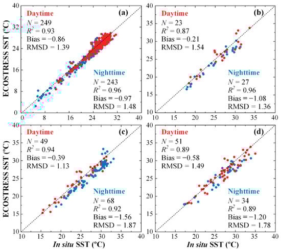 Comparison between in situ SST and ECOSTRESS SST in (a) CB, (b) LO, (c) CRE, and (d) FB from the matching pairs found between August 2018 and August 2020. The dotted lines are the 1:1 lines. Daytime and nighttime data are color-coded in red and blue, respectively.