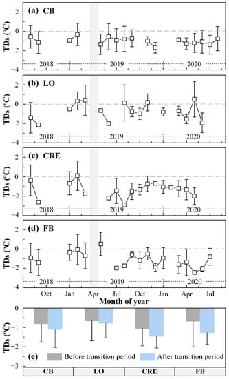 Mean monthly temperature differences (TDs) and standard deviations (STDs) between ECOSTRESS SST and in situ SST from the matching pairs found between August 2018 and August 2020 for (a) CB, (b) LO, (c) CRE, and (d) FB. The gray bars indicate the transition period when ECOSTRESS changed its data collection method. Data gaps are due to lack of matchup data pairs; The summary of TDs and STDs for each estuary or lake is shown in (e), with data separated by the transition period.
