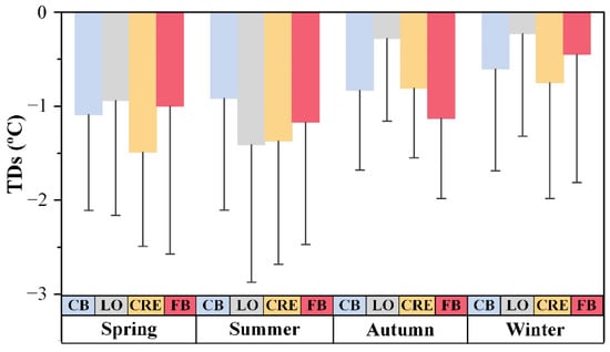 Seasonally mean temperature differences (TDs) and standard deviations (STDs) between ECOSTRESS SST and in situ SST from August 2018 to August 2020. The blue, gray, yellow, and red bars represent CB, LO, CRE, and FB, respectively.