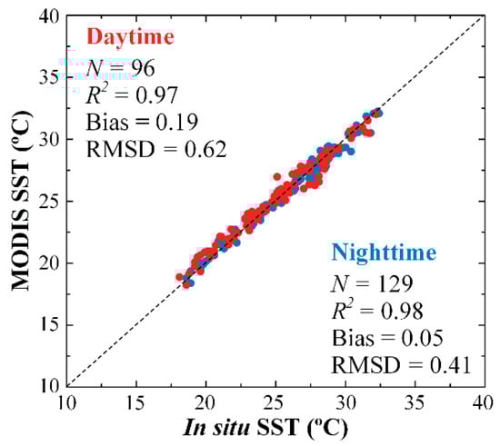 Comparison between in situ SST and MODIS SST in FB from August 2018 to August 2020. The dotted line is the 1:1 line. Data are color-coded for daytime (red) and nighttime (blue).