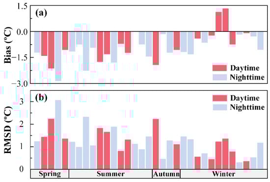 (a) Bias and (b) RMSD of ECOSTRESS SST against MODIS SST in FB between August 2018 and August 2020 for each season. Data are color-coded in red for daytime and blue for nighttime.