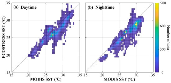 Comparisons between ECOSTRESS and MODIS SST from the 33 image pairs are presented in Figure 7a for daytime SST and Figure 7b for nighttime SST. ECOSTRESS SST covers a range of 18.01–34.72 °C and 17.58–34.47 °C during daytime and nighttime, respectively, while MODIS SST covers a range of 19.93–33.36 °C and 19.13–32.25 °C. From these density plots, it is clear that ECOSTRESS SST is systematically underestimated for all SST ranges, especially when SST exceeds ~25 °C during daytime. On the other hand, the negative bias is mostly small and can be corrected using linear regressions.
