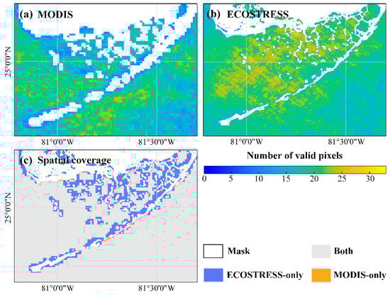 Number of valid pixels from 33 concurrent image pairs of (a) MODIS and (b) ECOSTRESS from August 2018 to August 2020. Note the resolution difference between MODIS (1 km) and ECOSTRESS (70 m); (c) Spatial coverage of the 33 concurrent MODIS and ECOSTRESS images between August 2018 and August 2020. White color represents land and masked pixels, and gray color indicates valid pixels from both ECOSTRESS and MODIS.