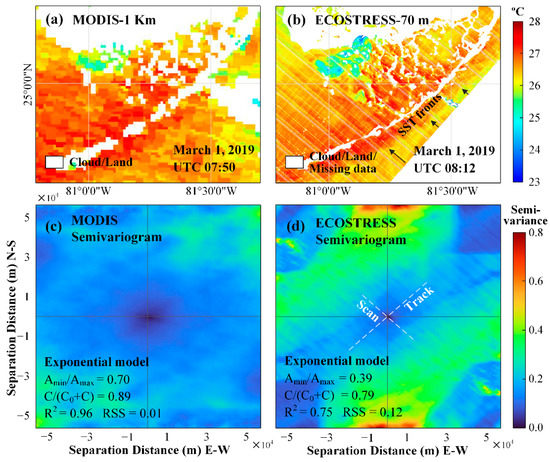 The finer resolution also enabled ECOSTRESS to capture more spatial features than being offered by MODIS, as demonstrated in the image pair of Figure 9a,b. In these images, ECOSTRESS shows more spatially coherent SST patterns, for example, the SST fronts south of the Florida Keys (arrows in Figure 9b). However, the ECOSTRESS SST data in Figure 9b shows distinct striping noise in the along-scan direction. This type of striping noise is typical in either scanning (east–west) or push broom (north–south) satellite sensors, and can be reduced in post-processing [,,]. Some of the noise is due to damaged detectors in TIR bands 1 and 5 and SWIR band during the pre-launch test, resulting in the loss of 8 rows of data per 128 rows in the cross-track direction in these bands []. Such striping noise is masked through the use of the QC bit flags (color coded white in the image), and was not used in any analysis above. Other striping noise is caused by the different detector responses [], which may cause unsmooth pixel-to-pixel SST changes in the along-track direction. Therefore, the image-based anisotropic variograms were derived to show the contrast between the two directions (along-track and along-scan) and the contrast between ECOSTRESS and MODIS images (Figure 9c,d). Here, based on spatial autocorrelation, variograms are used to describe spatial scales of variability (or “patchiness”) as well as the proportion of the variability captured at a given resolution [,]. The semivariance is obtained by calculating half of the squared difference of all pixel pairs that are at a distance from each other in any direction in an image. In such derived semivariance parameters, the ratio of minor range (Amin) to major range (Amax) between 0 and 1 is used to represent spatial anisotropy, with smaller ratios representing higher spatial anisotropy. A ratio of 1 corresponds to the isotropic case []. The ratio is 0.70 for MODIS and 0.39 for ECOSTRESS (Figure 9c,d), indicating higher spatial anisotropy in ECOSTRESS SST, apparently due to the striping noise. The nugget (C0) represents the unresolved variability at a given resolution that can be due to noise in SST data, and sill (C + C0) is the total variability of a region. From Figure 9c,d, C/(C0 + C) is 0.89 for MODIS SST and 0.79 for ECOSTRESS SST, suggesting 89% of structural and 11% non-structural variability in the MODIS SST image, and 79% of structural and 21% of non-structural variability in the ECOSTRESS image. The higher non-structural variability in the ECOSTRESS image is apparently due to the striping noise. On the other hand, ECOSTRESS appears to have higher semivariance at a large separation distance (e.g., >10 km), which is speculated to be caused by the periodic noise in ECOSTRESS. However, the above observations are based on one image pair only, and future studies may use more image pairs to make more statistically meaningful observations.