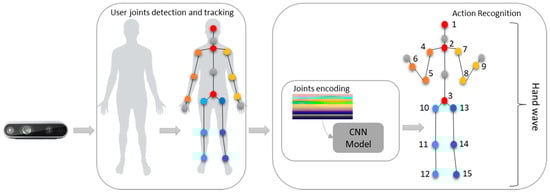 More recently, approaches based on Deep Learning techniques have been used and have yielded remarkable results in many recognition tasks. Most popular approaches use Recurrent Neural Networks with Long Short-Term Memory units (RNN-LSTM) for skeleton-based action recognition [,,], achieving high-level performance and showing superior results when compared to classical hand-crafted approaches. However, they tend to overemphasize the temporal information and lose the spatial information of skeletons []. Additionally, the amount of training time is considerably more when training LSTMs than CNN models, mainly because GPUs are optimized to process 2D data with extreme parallelism and speed, which CNNs utilize. Bai et al. [] show that a CNN could achieve similar or even better performance than an RNN in many tasks such as speech recognition [], some tasks of NLP [], among others. Following this trend, recent works in the literature have been employing Convolutional Neural Networks (CNNs) to tackle the HAR problem []. Many studies also indicate that CNNs are better than hand-crafted approaches since they have the ability to learn complex motion features [,,]. However, most existing CNN-based methods use only the RGB component, only the depth component, or a combination of both components (RGB-D) as the input to learning models. Indeed, RGB-D images are informative for action recognition, but due to the large dimension of the input features, their use increases the computation complexity of these models rapidly. Additionally, the computational burden can be increased by adding more layers, partially affecting the real-time response during the test and training phases, especially when fine-tuning the CNN models. Thus, resulting in more complex and slower models, less practical for solving large-scale real-time problems. In order to tackle the dimensionality problem and computation complexity, works in [,,,] use a skeleton-based representation with deep learning techniques for the recognition of different behaviors. The work proposed by [] consists of using skeleton-based representation data obtained from a 2D camera by using OpenPose [] for skeleton detection in order to recognize three main actions: Idle, Wave, and Walking. The pipeline consists of first detecting the human by using a YOLO V3 [] followed by skeleton detection and tracking to finally recognizing the action. The method achieved an overall accuracy of 97.1% in their use case, recognition of three actions in a parking lot scenario to be employed in automated vehicles. Although it is a step forward to reduce the model complexity and running time, this approach requires dedicated hardware (a dedicated GPU to run the models was used). Thus, future improvements in the pipeline configuration are necessary to optimize system performance. Another approach [] consisted of using a 3D sensor, the Microsoft Kinect V2, to extract the user joints coordinates. Then, the 3D data was converted into image space. This method speeds up the overall pipeline since the Kinect SDK detects and extracts in real-time the user joints coordinates. The authors used different configurations of the ResNet architecture by varying the deepness of the model. The architecture was evaluated on a dedicated NVIDIA GTX 1080 Ti GPU achieving an overall accuracy of 99.9% and 99.8% on the MSR action 3D [] and KARD [] datasets, respectively. Although the accuracy is high and the classification time for a skeleton sequence is around 0.128 s, it requires the use of a dedicated GPU with a final model configuration of 44 layers. The solutions proposed in [,,,] used dedicated hardware, having a considerable computational burden in both training and testing phases, compromising real-time performance.