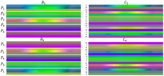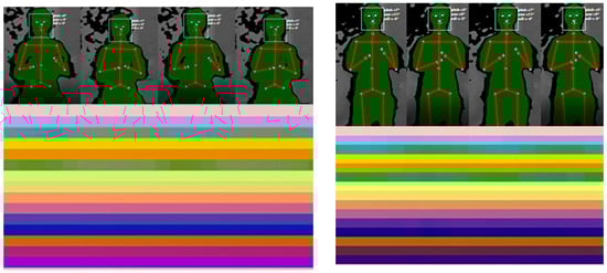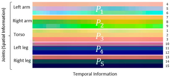 The human body is composed of four limbs and one trunk. This defines how actions are performed—a simpler action can use one limb, where more complex actions involve the coordination of two or more limbs and the torso. Following what is proposed in [], each skeleton frame is divided into five groups—two arms (, left arm, and , right arm), torso (), and two legs (, left leg, and , right leg)—which allows to keep the local motion characteristics, generating more discriminative features in image-based representations (Figure 3).