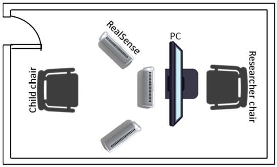 The experimental configuration used to extract the data for the dataset. The data was extracted by placing the Intel RealSense in three configurations: in front of the children, on his/her left, and his/her right.