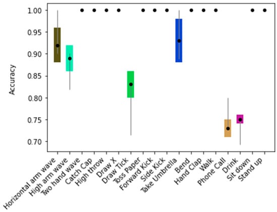 In general, the classes achieved mean accuracies of 100.0% (Figure 9) on the test data. Only 6 out of the 18 classes achieved a lower mean accuracy, namely: Horizontal arm wave (92.0% ± 4.0%), High arm wave (88.3% ± 3.2%), Draw tick (82.1% ± 3.6%), Take umbrella (92.8% ± 5.3%), Phone call (73.8% ± 2.6%), and Drink (74.1% ± 2.1%).