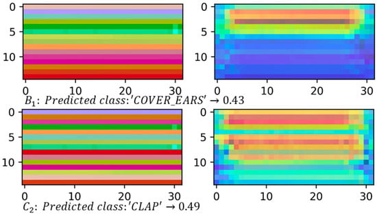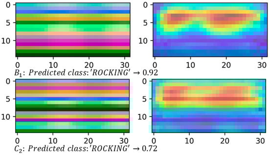 Figure 11 and Figure 12, on the left, show some samples of skeleton-based image representations for the classes ‘COVER_EARS’ (Figure 11) and ‘ROCKING’ (Figure 12) following the skeleton sequences and , respectively. On the right, class activation maps are shown for the models trained with the same skeleton configurations. The class activation map technique uses the Global Average Pooling (GAP) layer in CNNs to indicate, for a particular category, the discriminative image regions used by the CNN to identify that category []. It could be used to interpret the prediction decision made by CNN. It is possible to observe that according to the sequence of the joints, the CNN is triggered by different semantic regions of the image. The model trained with the skeleton sequence correctly predicted the ground-truth class ‘COVE_EARS’ with the top prediction score of 0.43. Conversely, the model trained with the skeleton sequence incorrectly predict the sample as ‘Clapping’ with the top score of 0.49. Considering the samples for the ‘ROCKING’ class, both models correctly predicted the ground-truth class. However, the model trained with samples with the joints sequence presents a lower prediction score of 0.72.