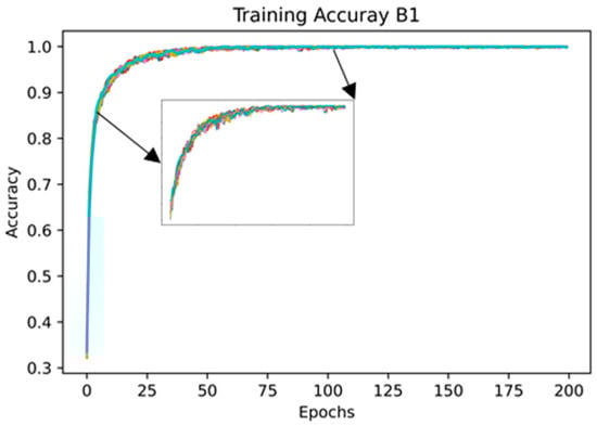 Since the skeleton configuration presents the highest mean test accuracy (92.4% ± 0.0%), the following results used this configuration. Figure 13 shows the training accuracy plot of the model over the 20 runs. It is possible to see that the training converged rapidly and, in general, it remained stable over the 200 epochs.
