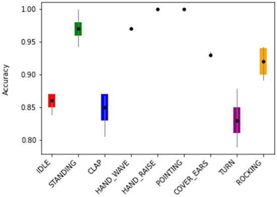 The present method achieved a similar performance for ‘ROCKING’, while it outperformed the other works for the detection of stereotyped behavior ‘HAND_WAVE’.